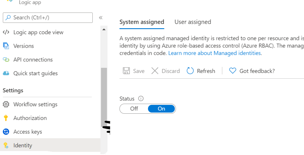 In the main page of your logic App scroll down on the left side pane, you will find something called “Identity”. Click on that, and then click on the status slider. Make sure it is on.