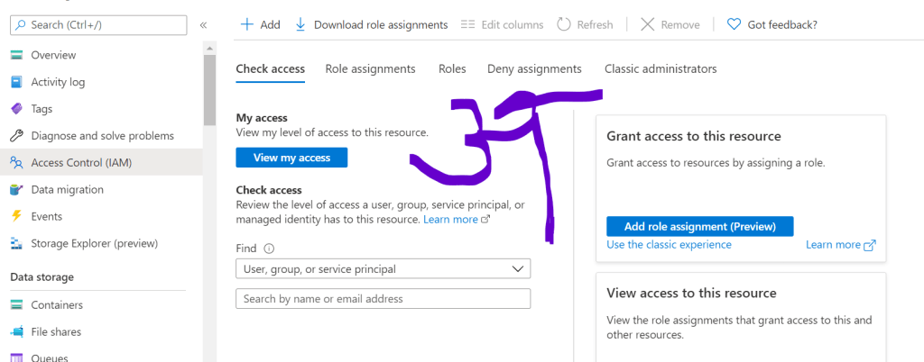 When you click on your storage account, this is the first page that you get in. On clicking upon, the right hand side slider, IAM, the above mentioned page would appear.